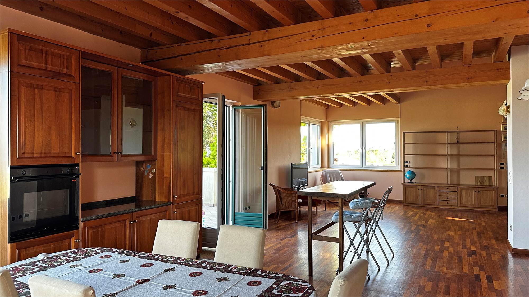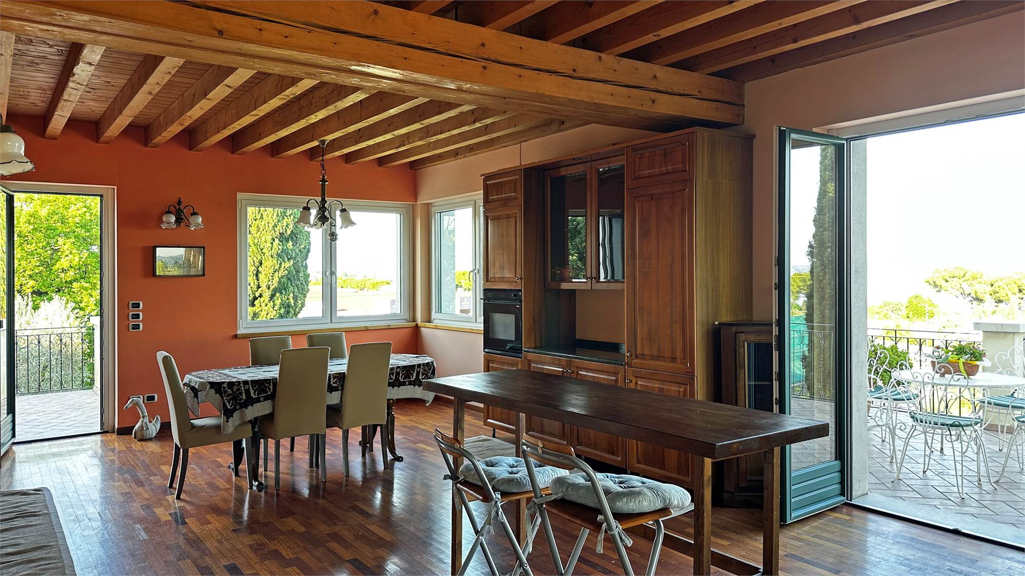 Grande soggiorno con cucina a vista, affacciato su due terrazze panoramiche