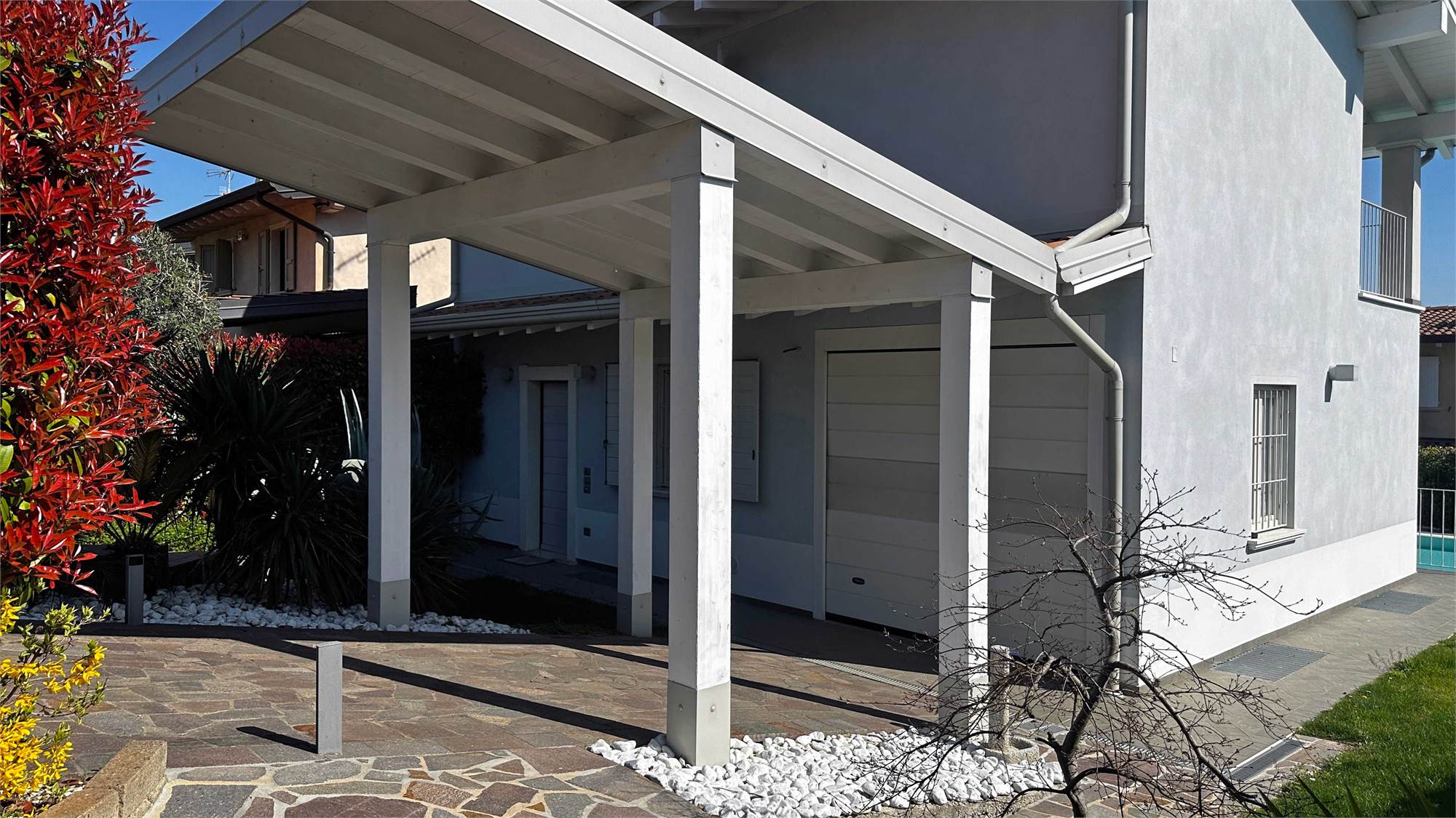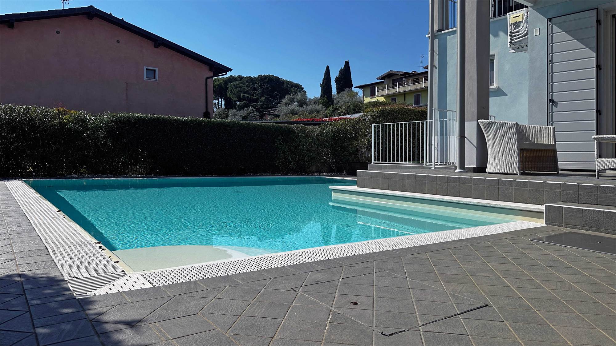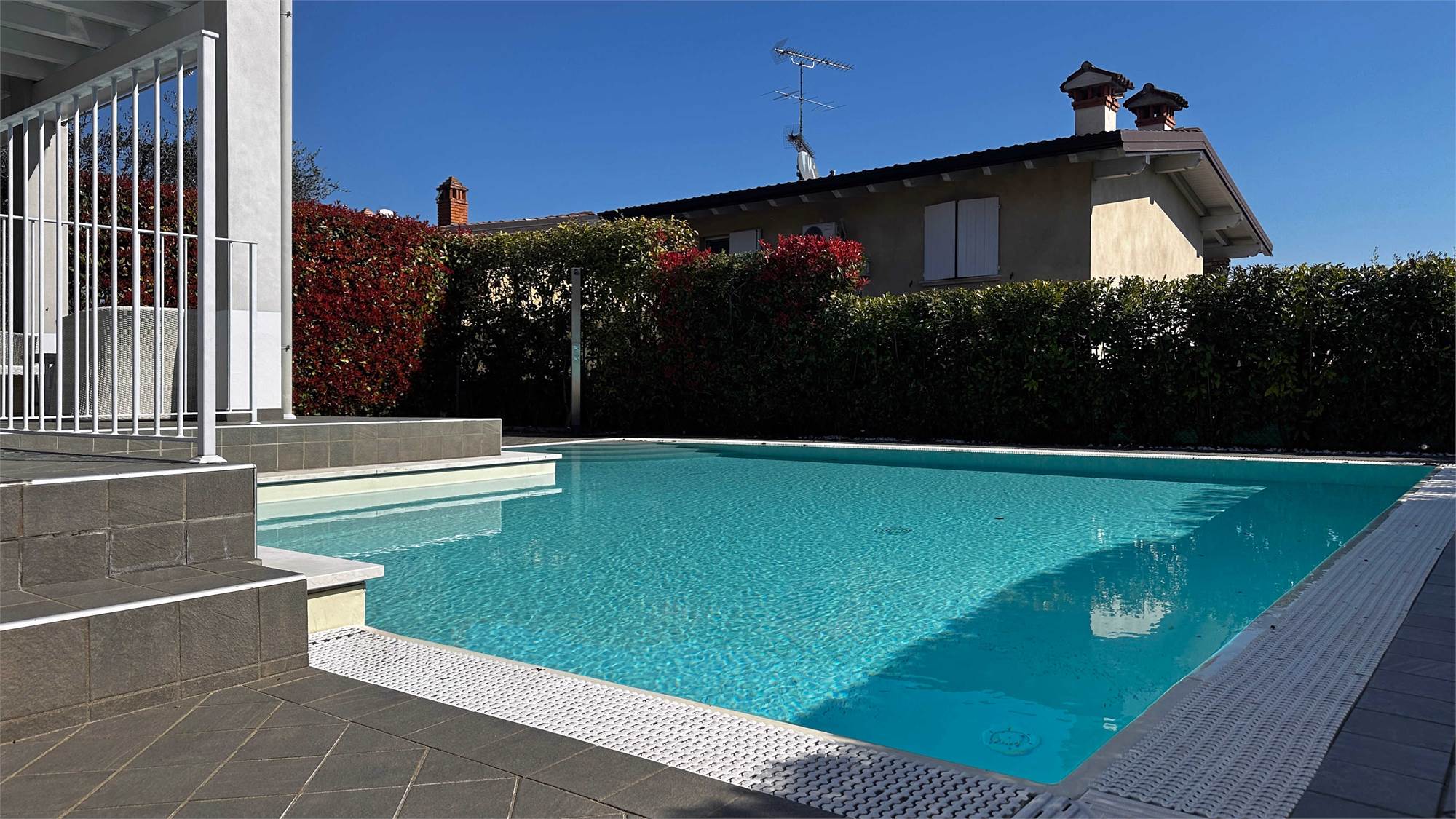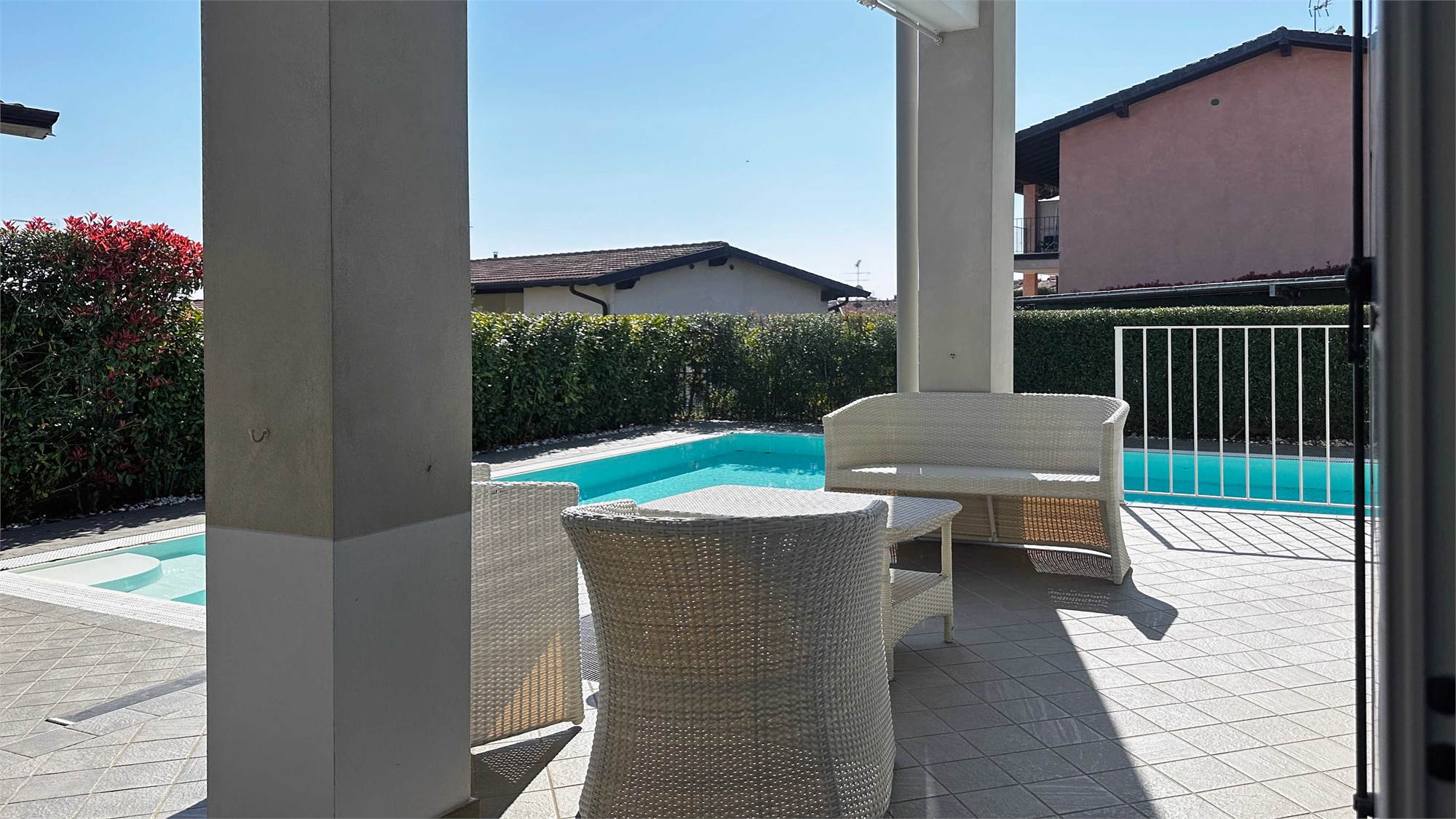 All’esterno, la villa è valorizzata da una bella piscina privata con zona solarium, perfetta per momenti di relax e convivialità, oltre a un curato giardino esclusivo e un portico vivibile che invita a godere appieno della tranquillità del contesto.